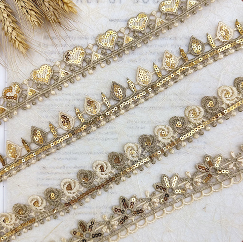 カスタムゴールド刺繍レーストリムファンシーギプールレーストリムストックハートレースドレスウェア縫製用