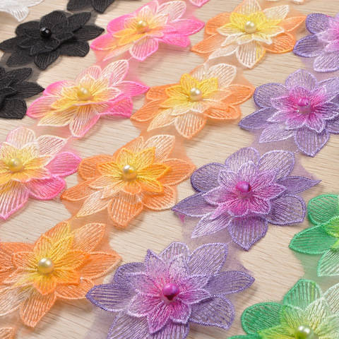 Bán Buôn 54Mm Polyester 3D Hoa Organza Bead Ren Đầy Màu Sắc Thêu May Trên Hoa Ren Trim Cho Ăn Mặc Quần Áo Trang Trí